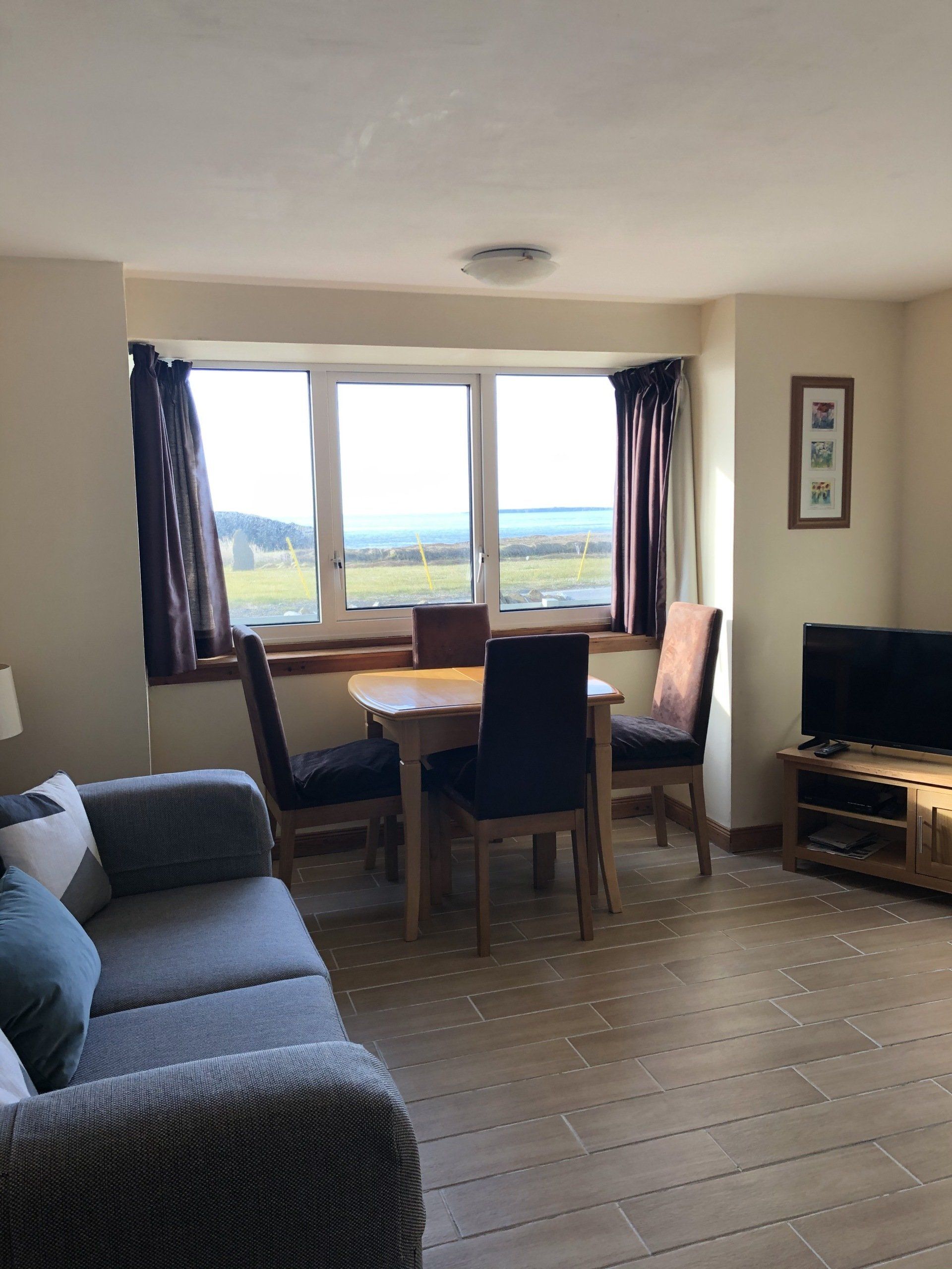 Dining table & chairs, sofa bed, TV ~ Video, CD player & radio.